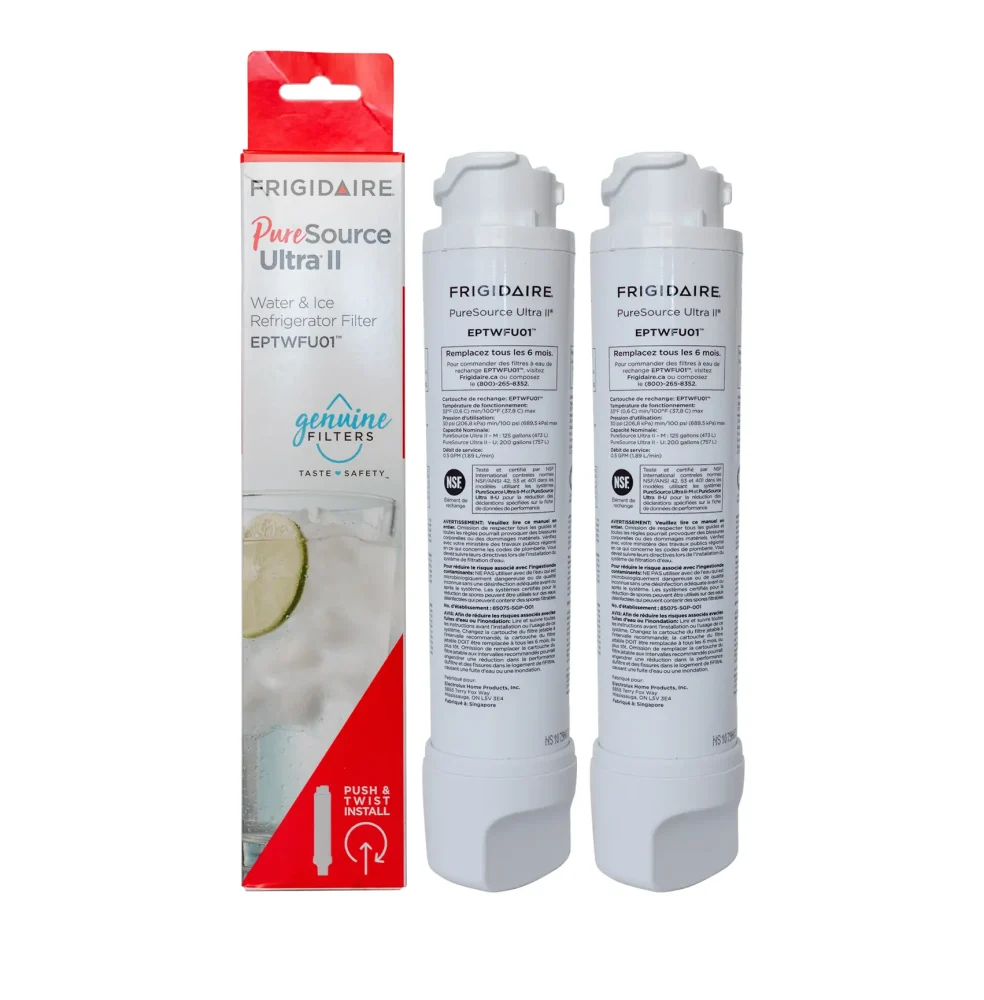 The Frigidaire EPTWFU01 2‑Pack provides up to 12 months of high‑quality filtered water and ice. Reduces up to 99% of contaminants including chlorine, lead, pesticides, BPA, and more with convenient push‑to‑twist installation.