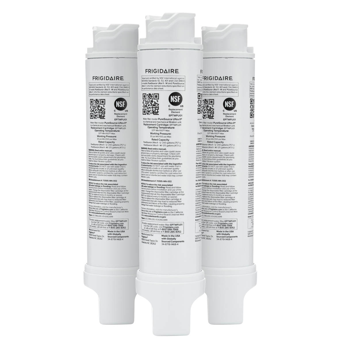The Frigidaire EPTWFU01 PureSource Ultra II® 3‑Pack is ideal for households that want an extended replacement supply without frequent ordering. Each filter in this pack uses premium multi‑stage activated carbon filtration that meets NSF/ANSI Standards 42, 53 & 401, helping reduce up to 99% of common contaminants — including chlorine, lead, mercury, BPA, pesticides, asbestos, and many pharmaceutical remnants — that affect household drinking water and ice quality.